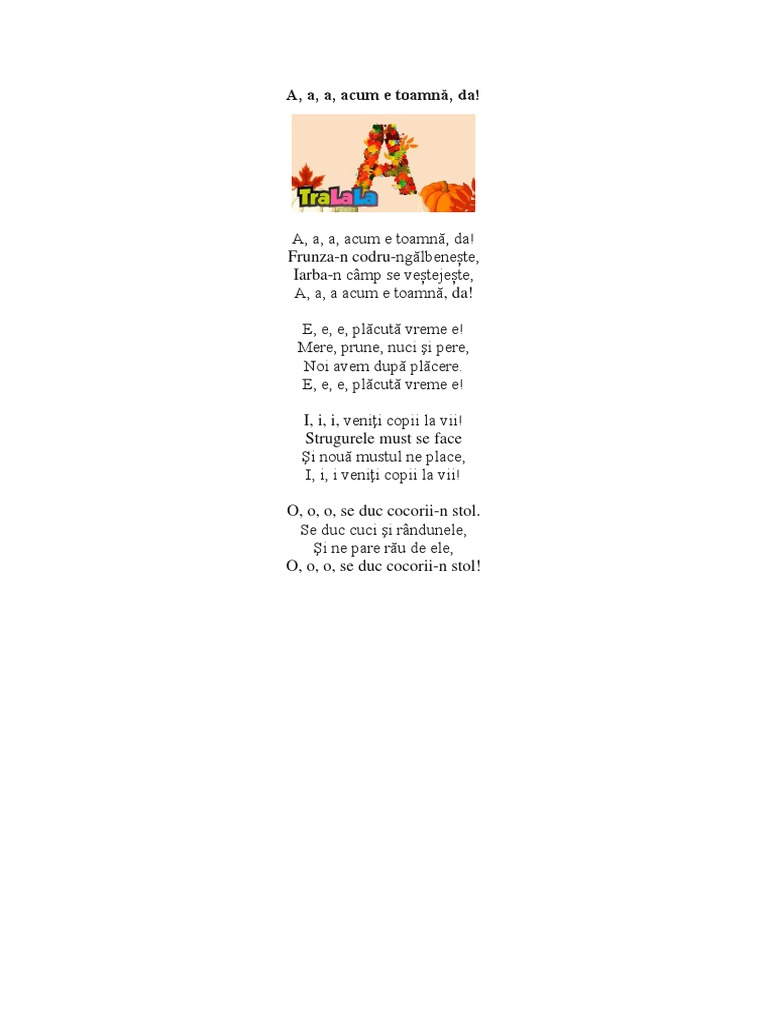 A a a acum e toamnă da! E e e plăcută vreme e mere prune nuci și pere, noi avem după plăcere e e e plăcută vreme e. Mere, prune, nuci şi pere noi avem după plăcere.