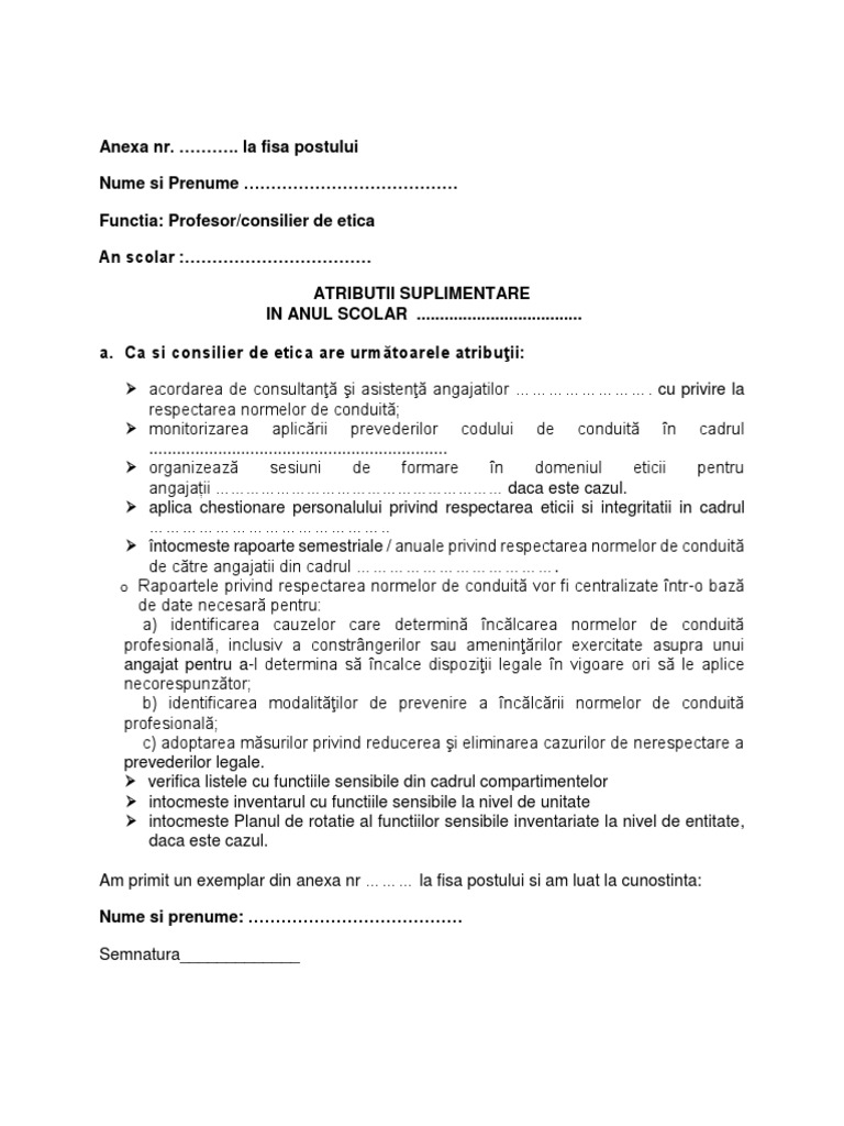 Finalizarea lucrarilor de reparatii la scoala gimnaziala letcani. Nivel legislativ, profesiunea de consilier imprumutând o serie de reguli etice de la psihologi, pedagogi şi sociologi. Dispozitie desemnare consilier etica pentru functionari.