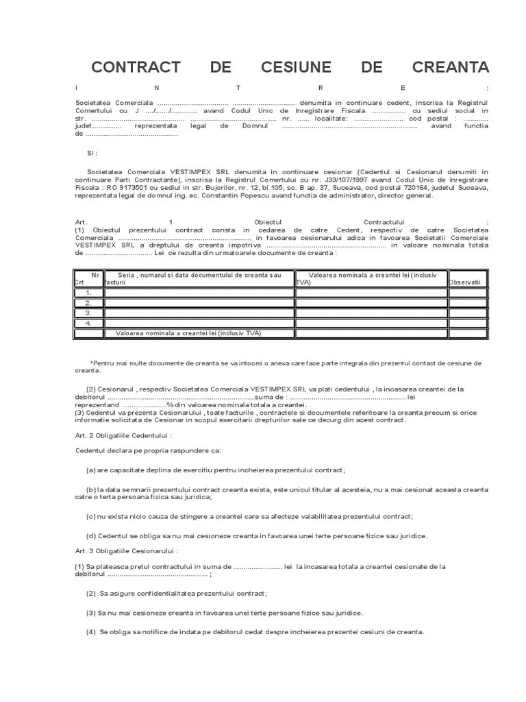 Contractul de cesiune de creanta este un contract prin care o parte, numita cedent, transmite altei parti, numite cesionar, creanta care ii apartine. Cu numar de ordine la oficiul registrului comertului…… in baza contractului de cesiune de creanta nr……. Model de contract de cesiune de crean1. Codul nostru civil reglementează cesiunea . Cesiunea de creanta reprezinta un contract prin care un creditor (creditor cedent) transmite unui tert (cesionar) creanta pe care o detine impotriva .