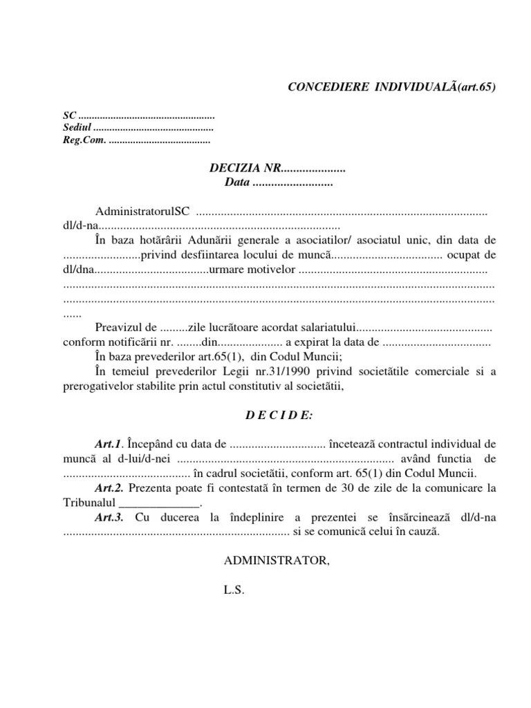 Art.65 Codul Muncii : Ordin De Angajare Din Functie. Acesta este un fragment din codul muncii din 2003. Incetarea contractului individual de munca sectiunea 4: Contestatia salariatului impotriva deciziei de concediere intemeiata pe dispozitiile art. Sotia a fost concediata cu art 65/1 fara preavi. Cumpăraţi documentul în formă actualizată sau alegeţi un abonament lege5 care permite accesul la orice formă .
